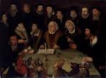 The dark-toned painting past an unknown artist depicts Martin Luther, head of the Protestant Reformation, surrounded by more than a dozen other Reformation figures, including John Calvin and Theodore Beze. [20] Grünewald'southward paintings rely on northern art, literature, and reformation theology for inspiration. [13] The Northern painters in general moving away from depicting biblical scenes and turned to painting ordinary people in a commonplace setting tin exist inferred to have been influenced by the Protestant- Reformation. [11]